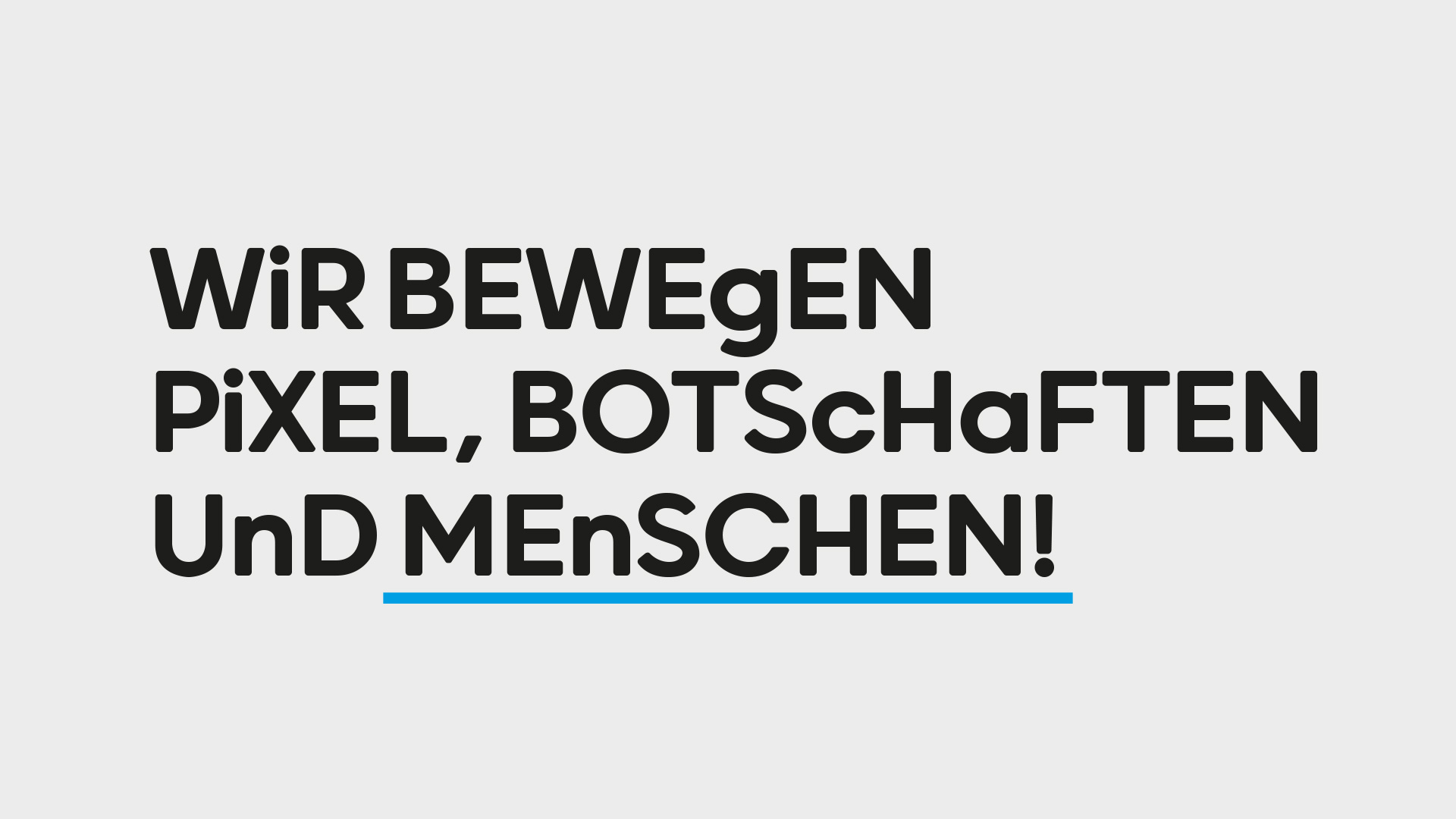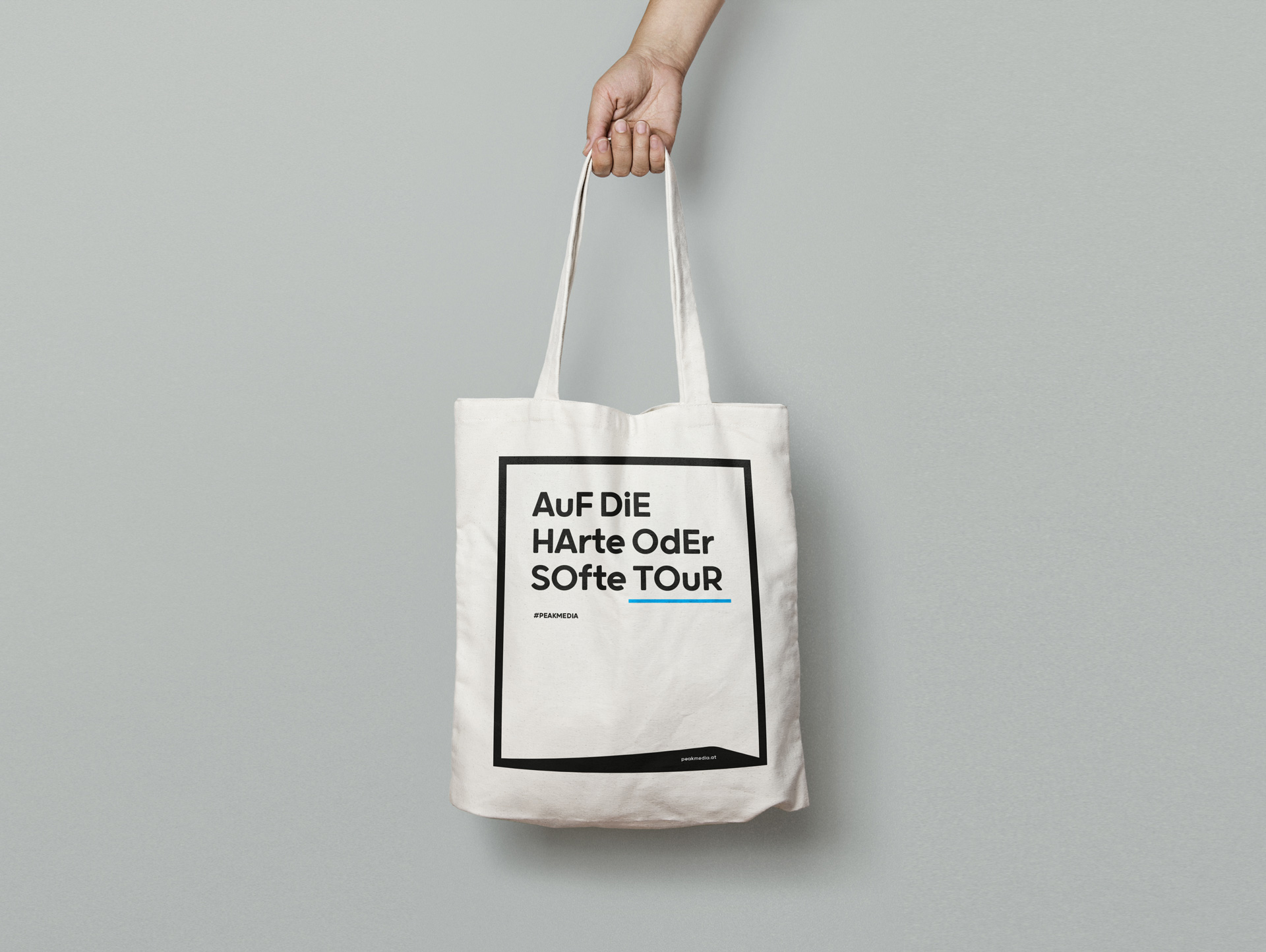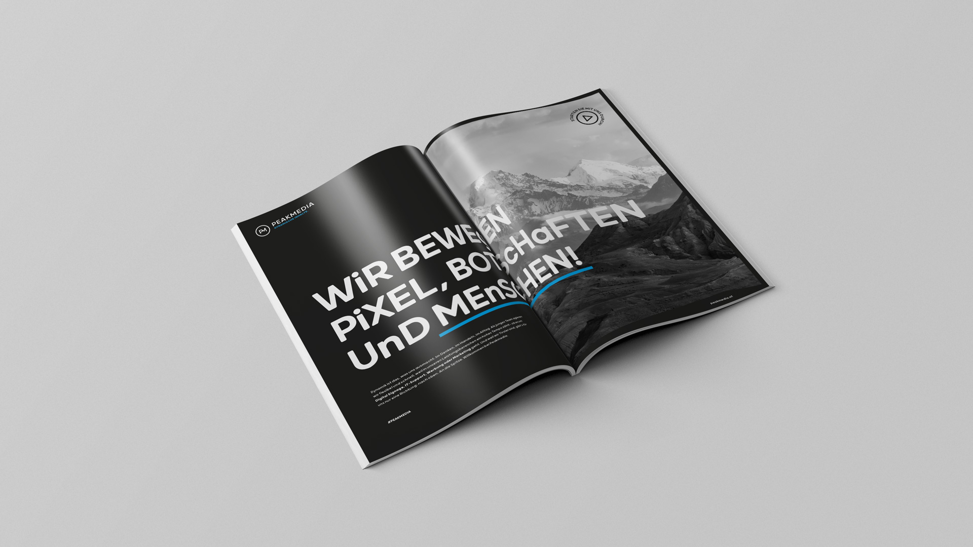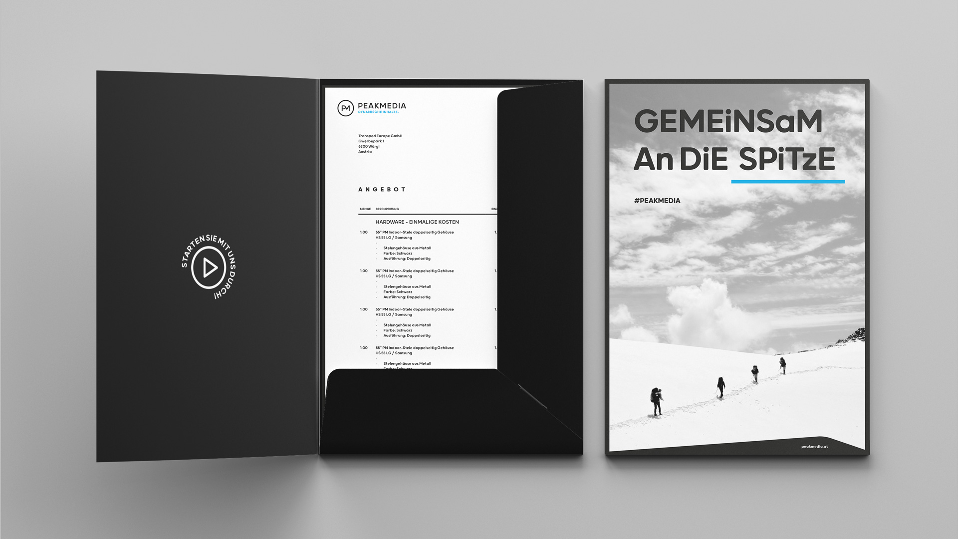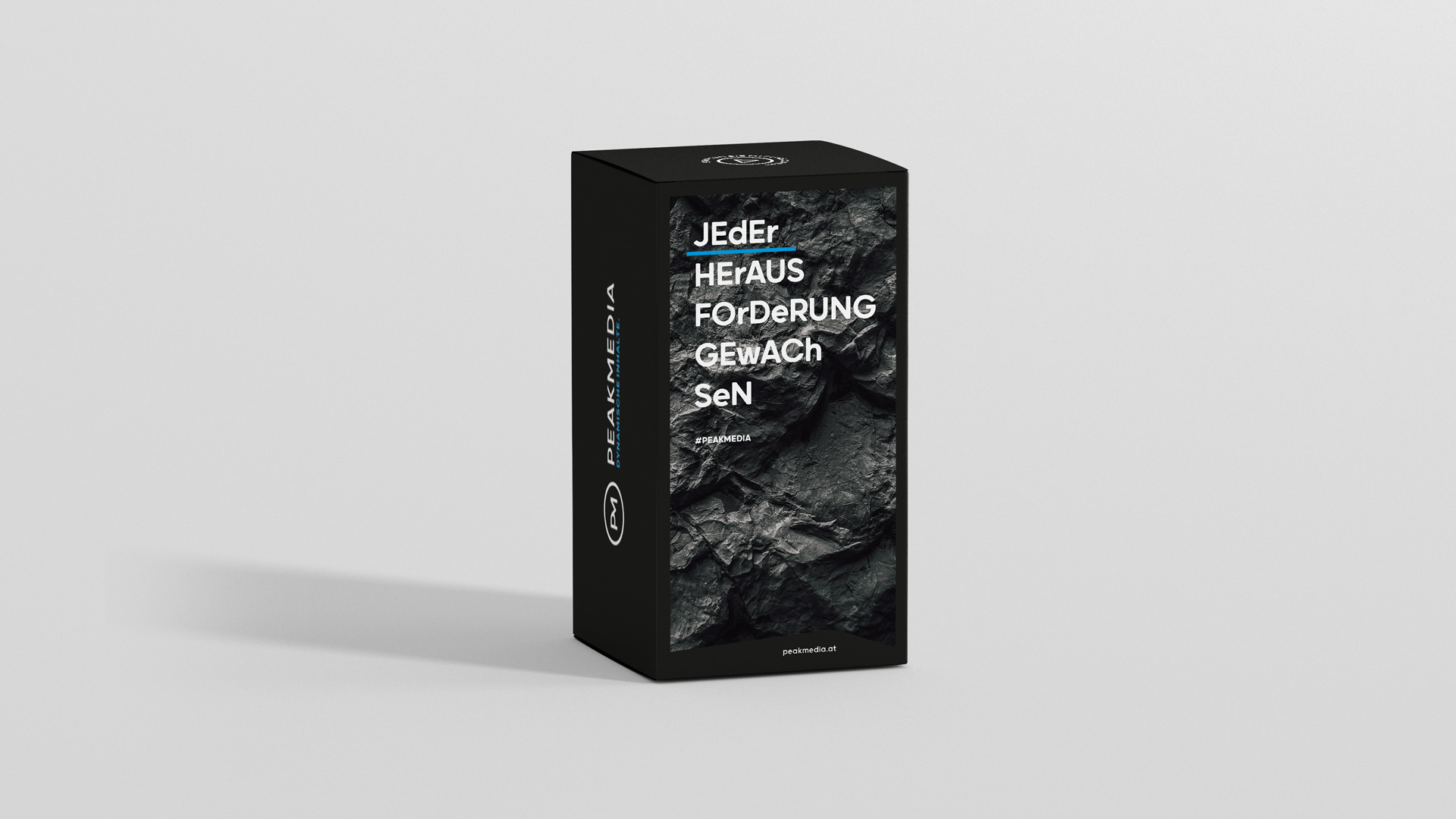 Die Agentur Peak Media setzt im Bereich Digital Signage neue Maßstäbe und bewegt sich am Peak der Zeit. So dient uns ein Monitor/Screen als grafisches Designelement, das sich durch das gesamte visuelle Kommunikationskonzept der Marke zieht und als symbolhafter Rahmen für die Textbotschaften fungiert. Das typografische Zusammenspiel von Bild und Text erzeugt Spannung, vermittelt Dynamik und unterstreicht den modernen Gesamtauftritt.